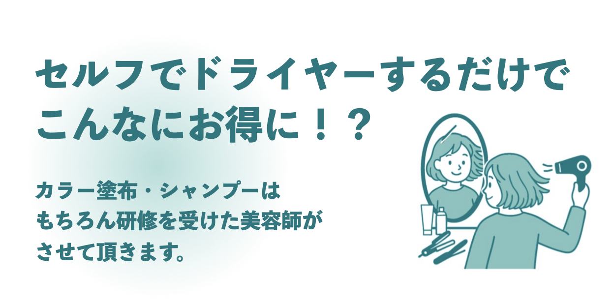 当店では品質の良いカラー剤、シャンプー・トリートメントをリーズナブルにご提供する為、お客様ご自身での【セルフブロー・セルフスタイリング】のみをご協力頂いております。